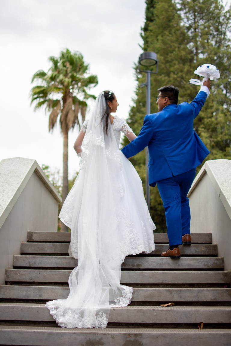 A stylish, dark-themed photo shoot capturing a joyful couple at a wedding.